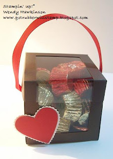 This is a very sweet little cupcake box that I found the tutorial for on Becky Robert's blog. However, I didn't have any cupcakes made to put in so instead----REESE'S PEANUT BUTTER CUPS! These are my favorite candy so I know I have to give this away Tuesday night at my Hostess Club. It cannot stay here or it will be an empty box in no time. :)